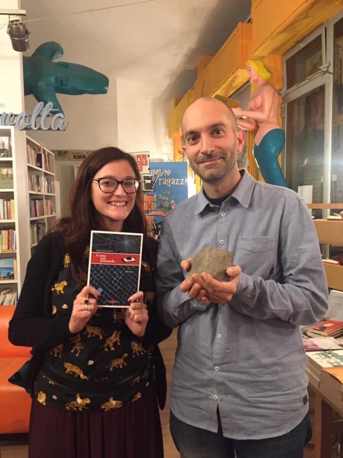 Qui sotto, io che sfoggio la mia copia del libro, la prima venduta, insieme all’autore, dotato di sampietrino 😉